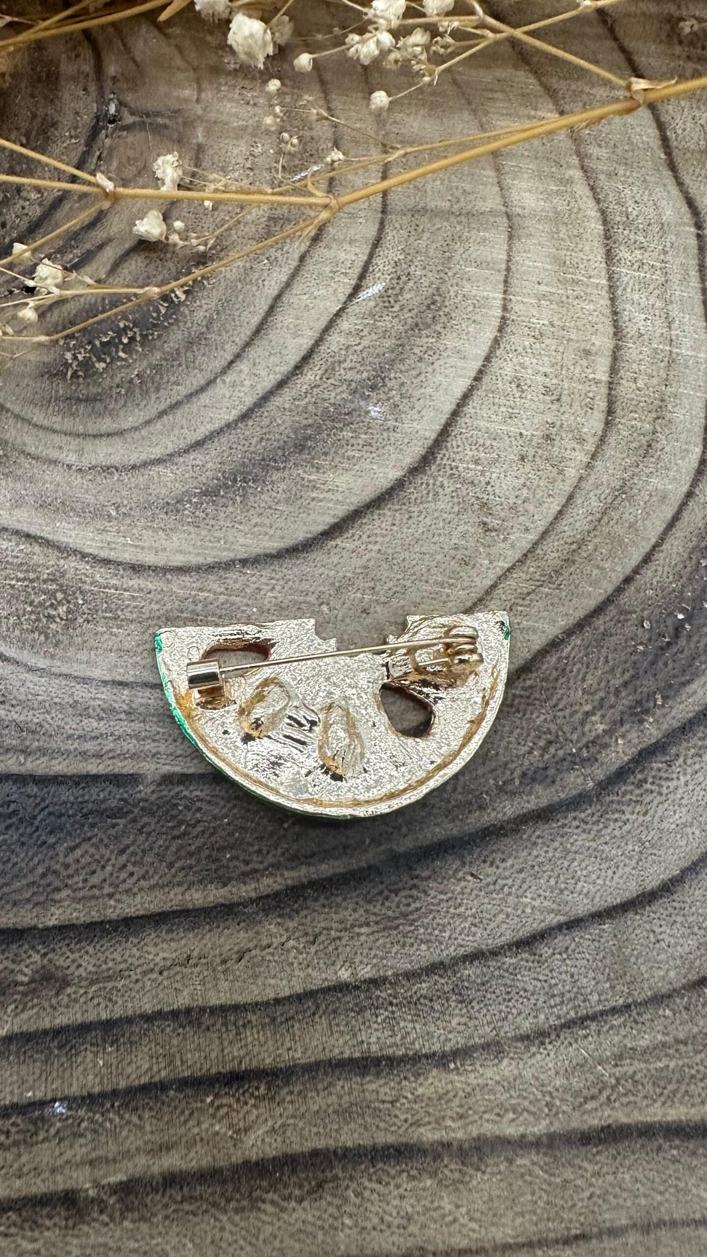 Wassermelonen-Brosche mit funkelnden Strasssteinen: Der grüne Rand erinnert an die frische Schale, das Innere ist mit leuchtend roten Steinen besetzt und kleine schwarze Steine setzen die typischen Kerne in Szene.