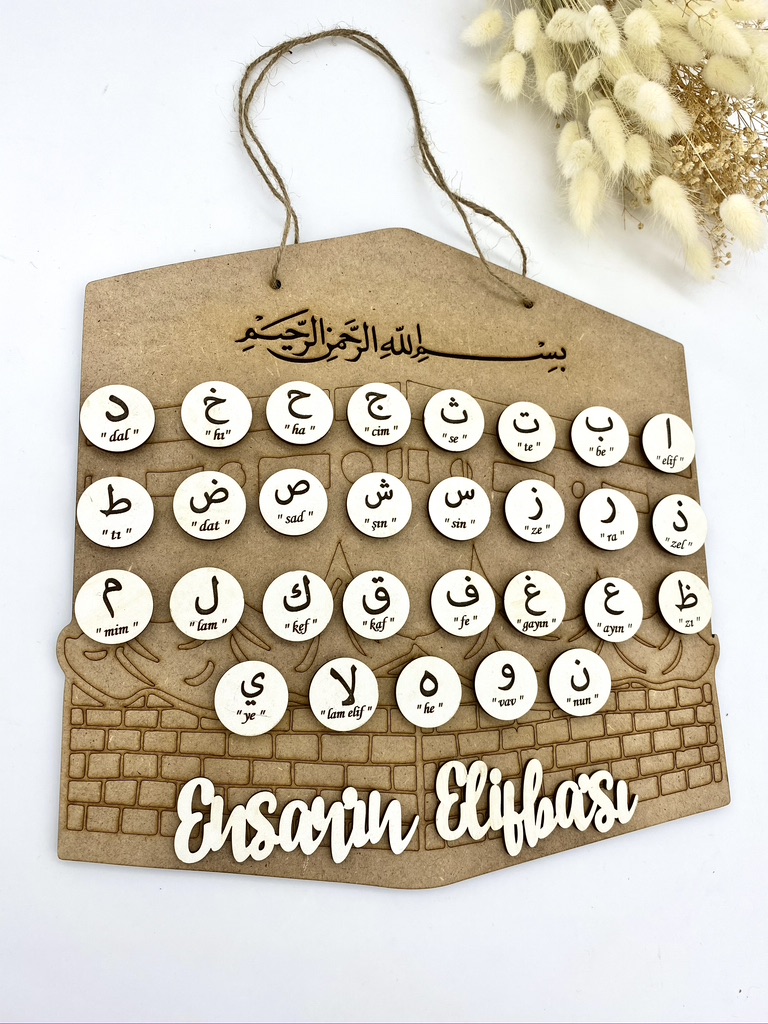 Personalisiertes lehrreiches Elifba in Kaaba-Form für die Kids zum Aufhängen. Schriftzug kann in den Farben gold, silber und weiß angefertigt werden. Ein Doppelname ist leider nicht möglich.
