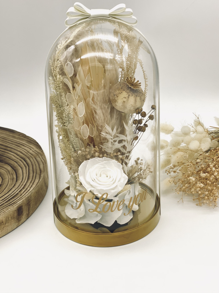 Glasglocke mit verschiedenen Trockenblumen wie abgebildet und deinem Wunschtext.