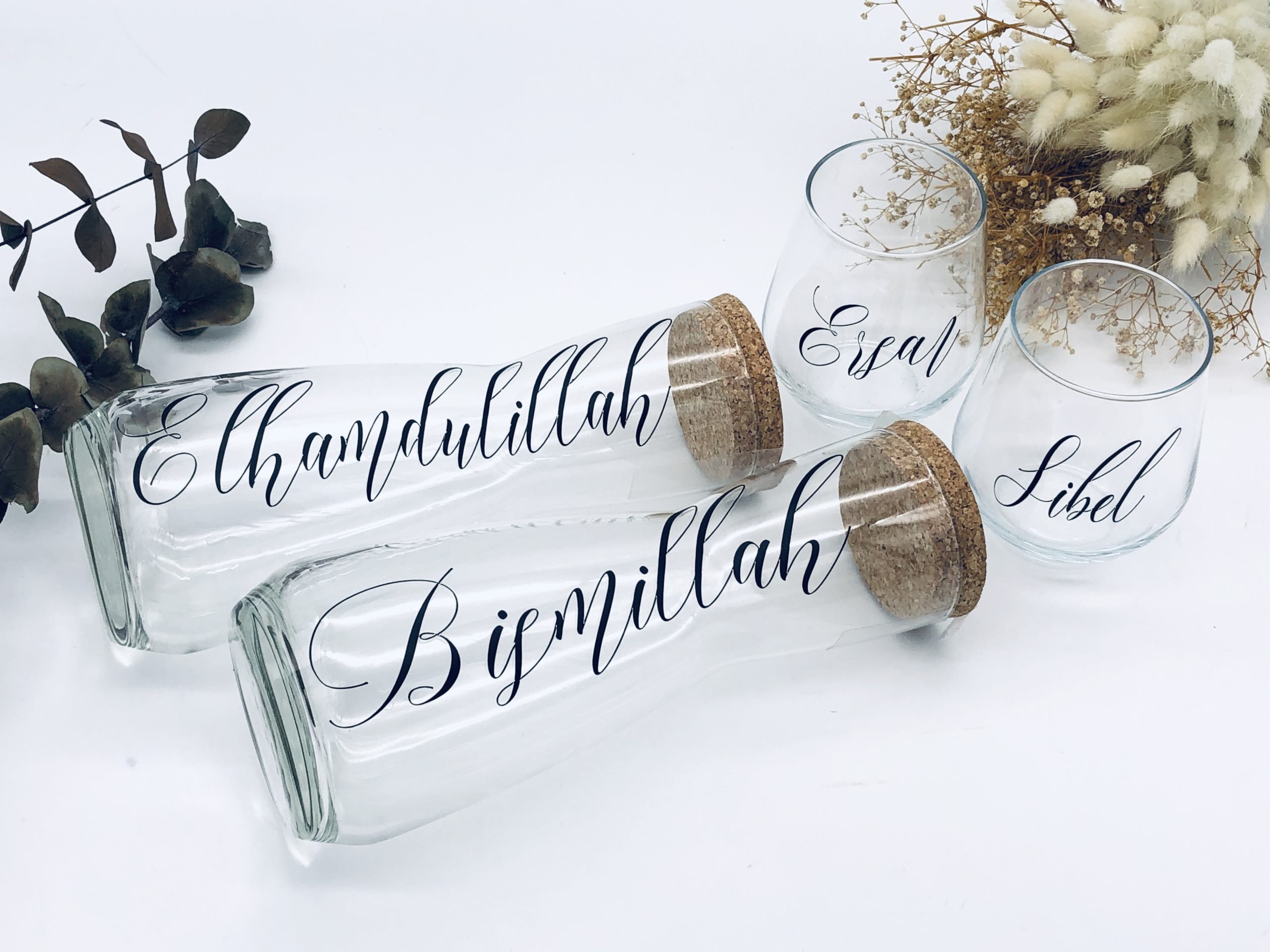 Personalisiertes edles Set bestehend aus zwei Karaffen und ab zwei Gläsern mit einem Schriftzug aus Vinylfolie.