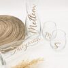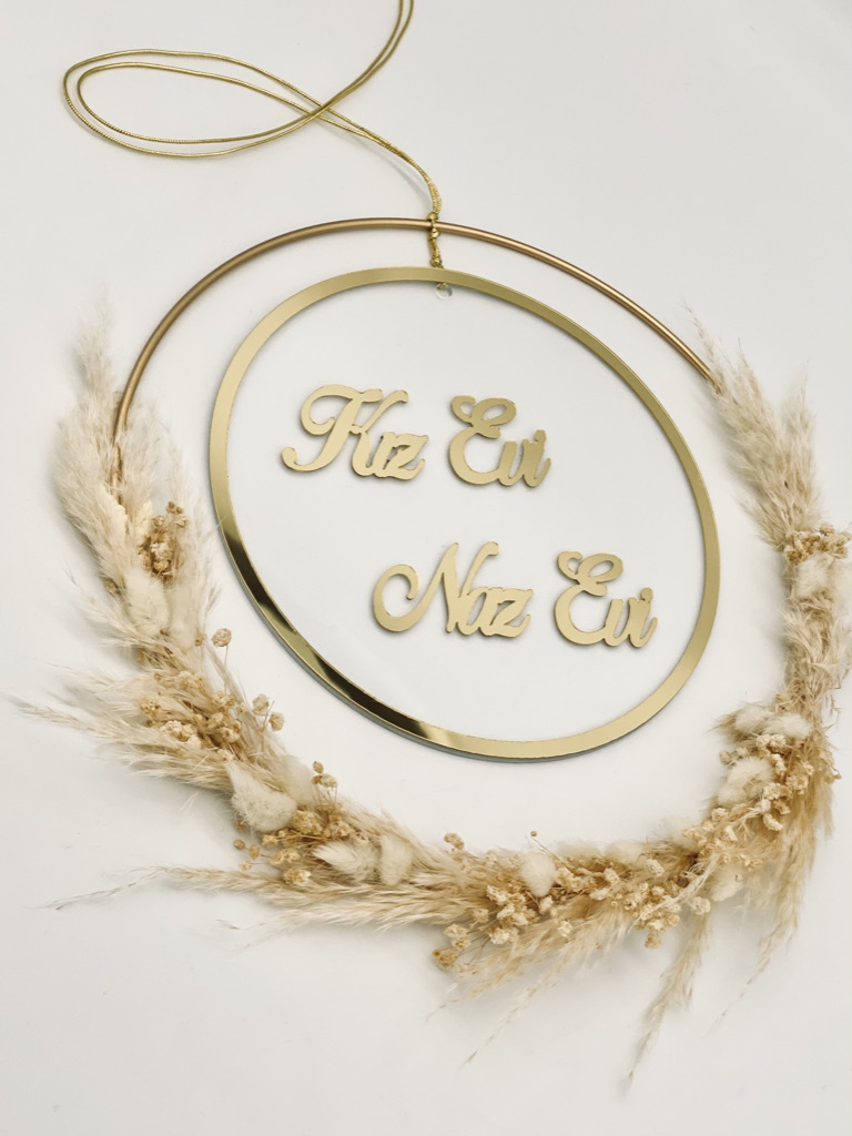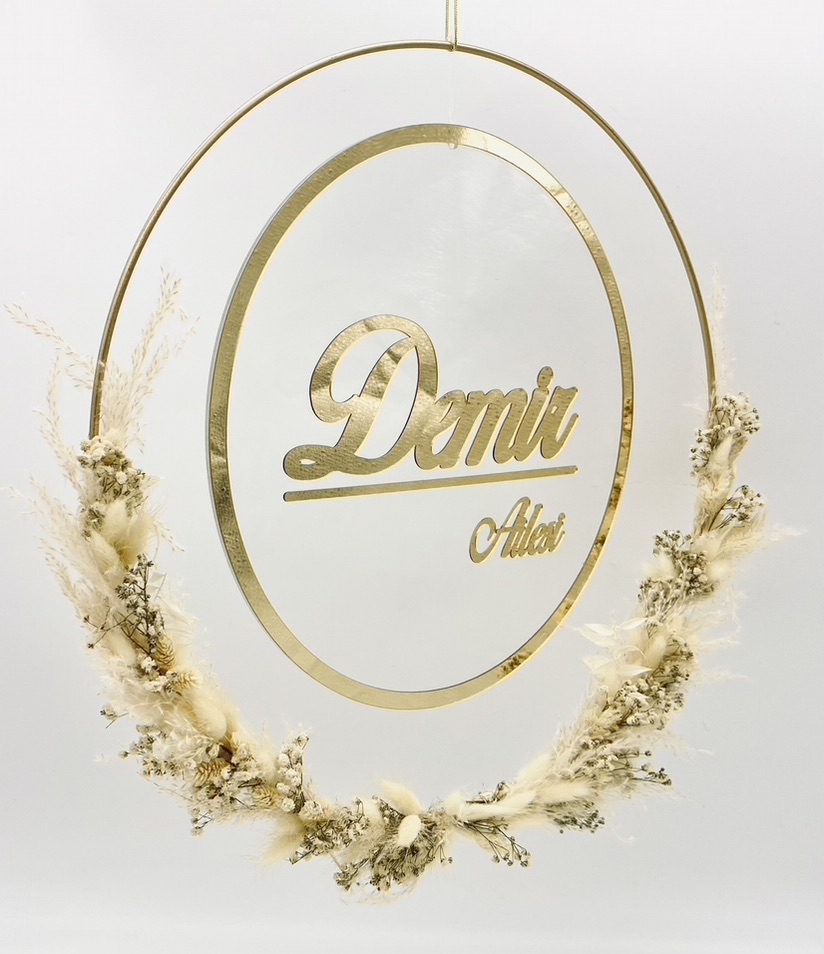 Mit Trockenblumen verzierter Metallring und einem personalisiertem Schild aus Acrylglas.
